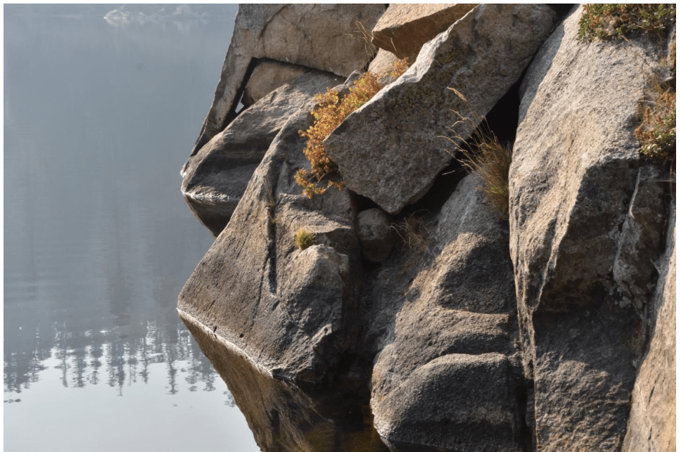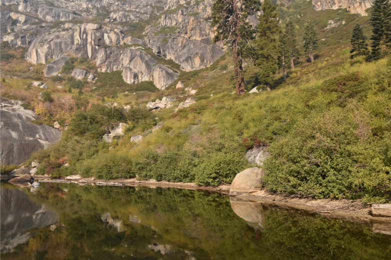 Beyond the mountain alders, an even denser pygmy forest of huckleberry oak, flows down the steep slope to the water’s edge. The huckleberry oak is the only high elevation oak in the big family of oaks, the most populous tree family in California. The huckleberry oak’s thin, flexible branches allow the tree to sprawl prostate over granite boulders. In a region of short summers, the acorn takes two autumns to mature. Once ripe, the little acorn is a favorite food of chipmunks and other small rodents.