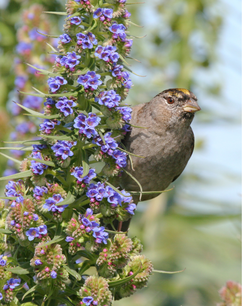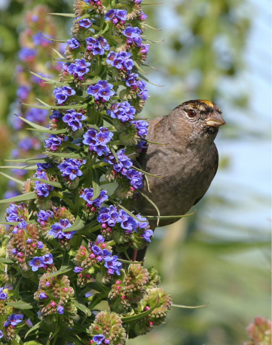 Over the last few days, Bay Area birders are plucking my heart strings by reporting the first Golden-crowned Sparrows of the season. I remember those chilly mornings in the Berkeley Hills when I would walk up the street towards the pasture whistling their song. If they had arrived in the early morning hours after a long night’s flight, they answered me with one or two minor key notes. I would yelp with joy and dance a quick jig. When I returned home, I made an entry in my notebook, circling the date in red.