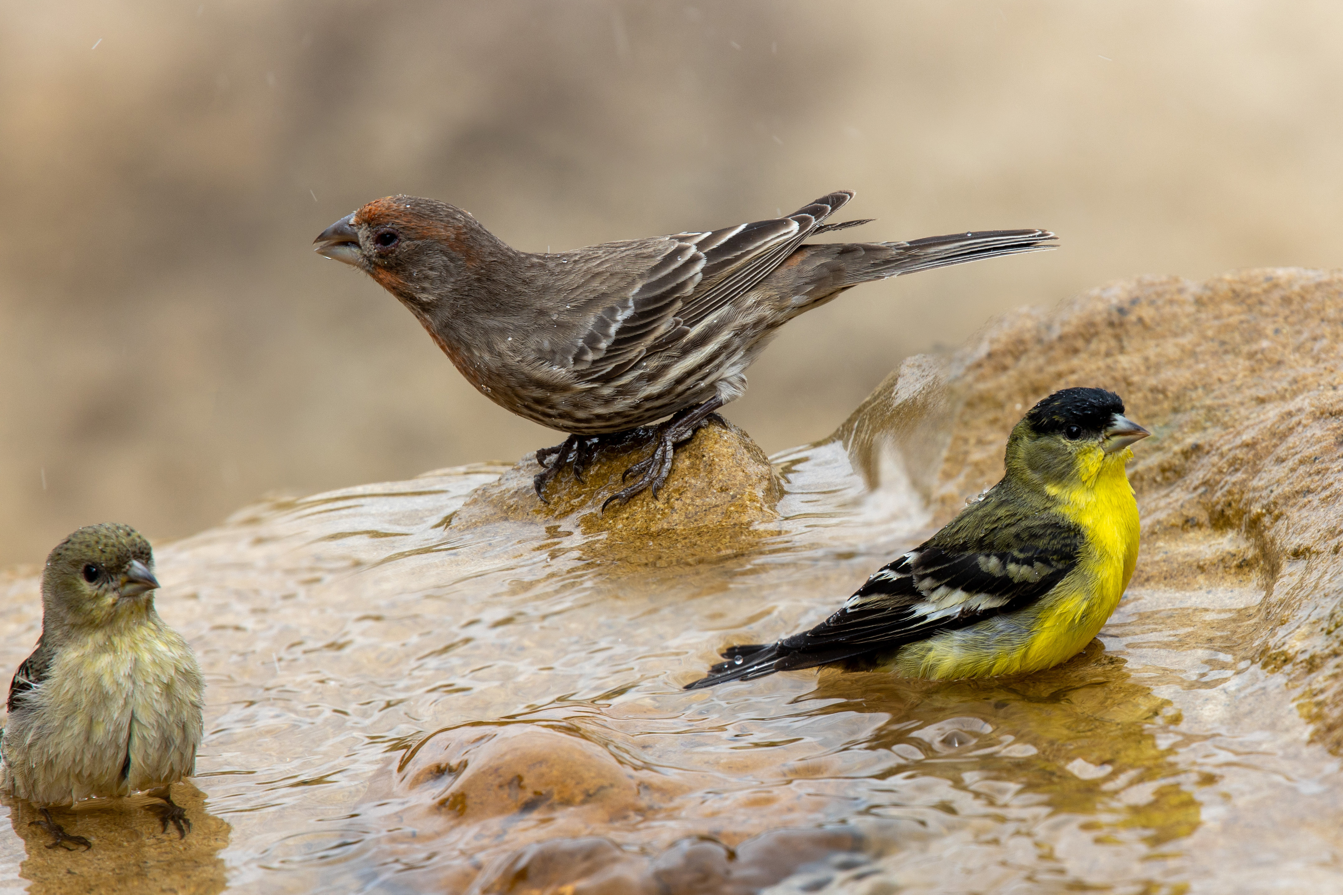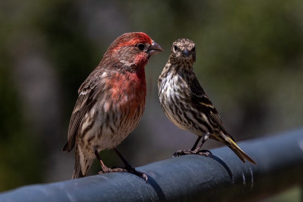 (6) Male House finch(L) and Pine Siskin appear to be comparing stripes.