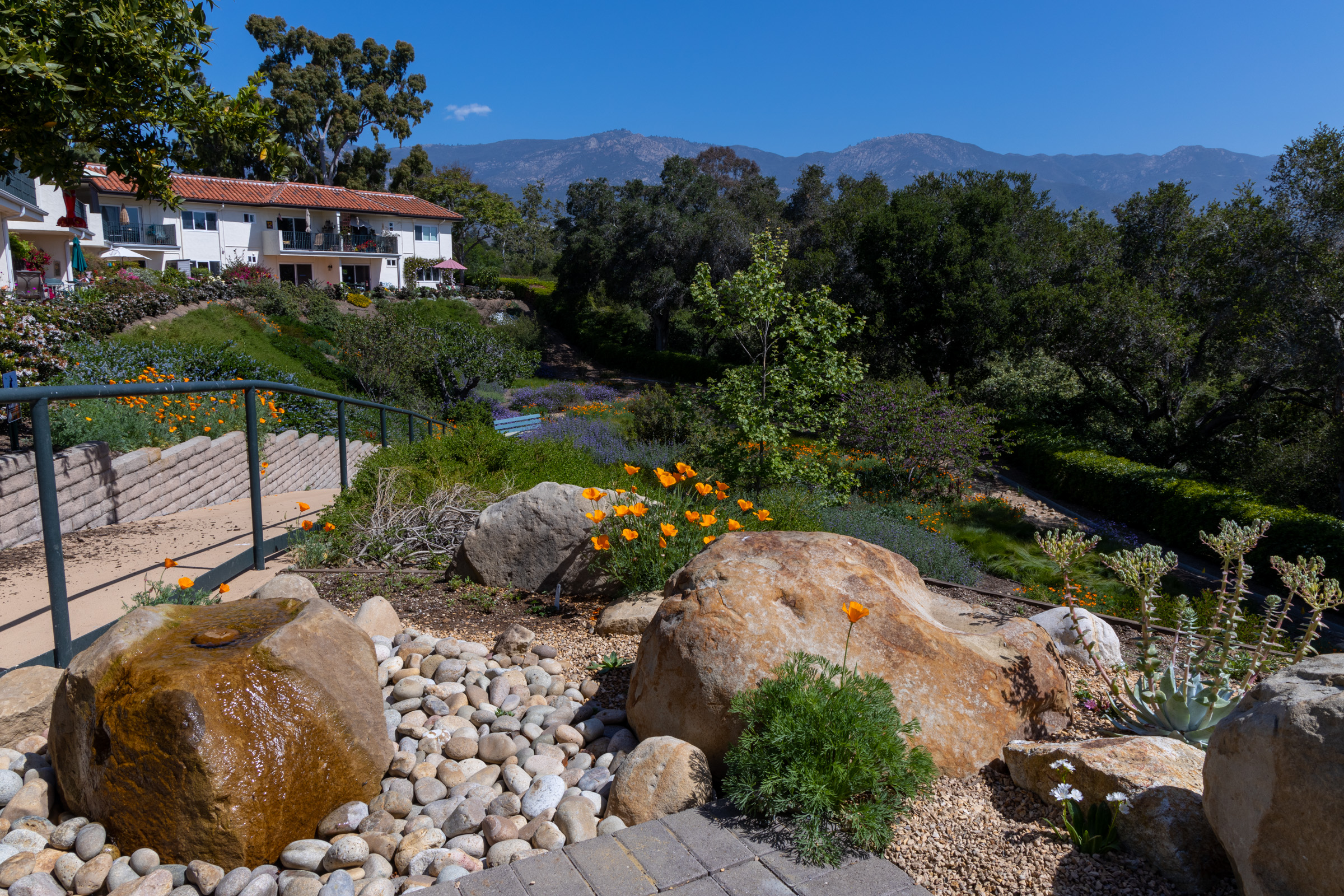 The sandstone fountain, we call “Bubbling Rock” in the foreground overlooks the Native Plant Garden.