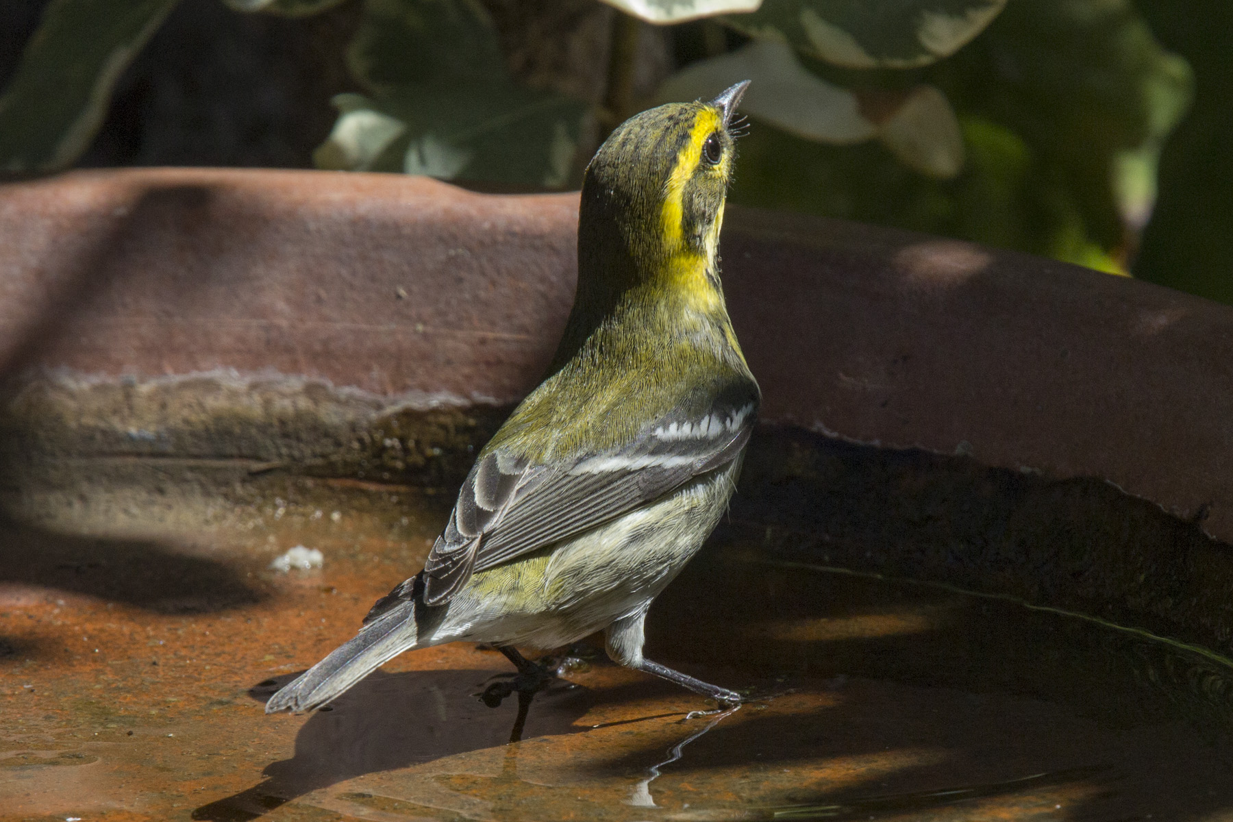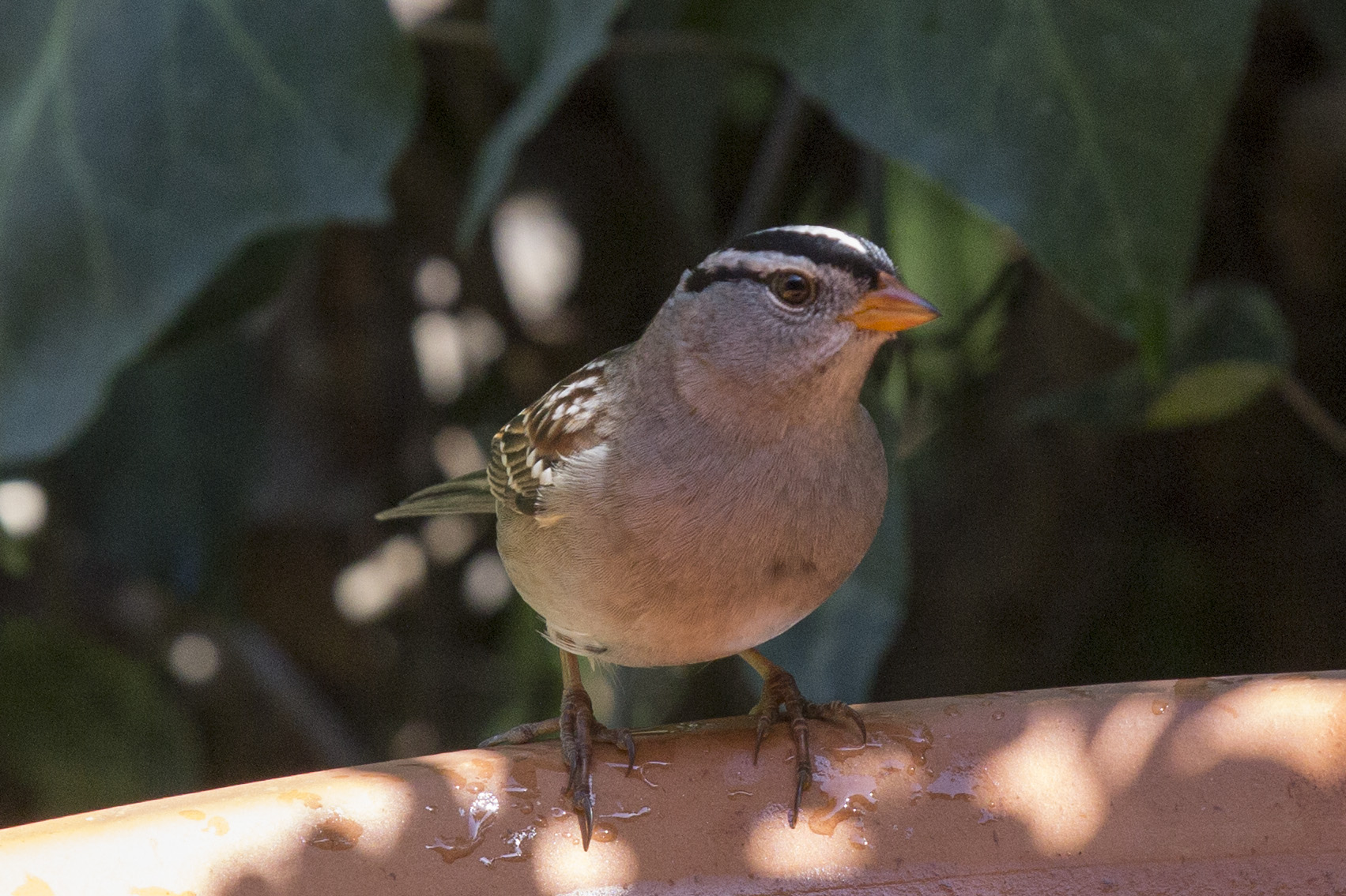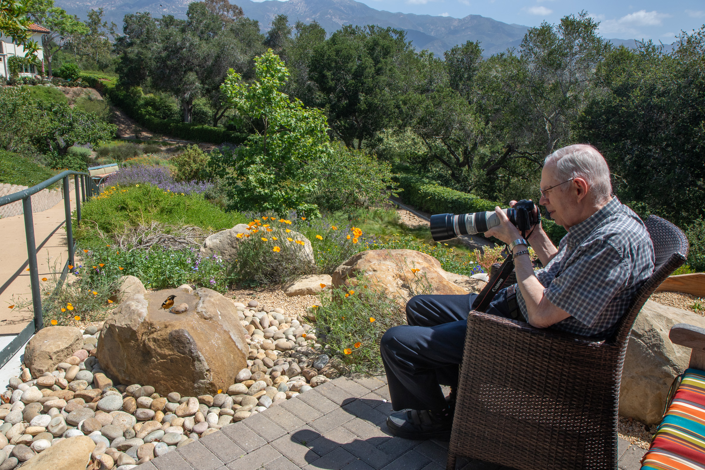 The birds are drawn to the area by Mission Creek and its forest of sycamores and Coast Live Oaks. Ann has arranged a welcoming collection of shallow pot bottoms filled with water, surrounded by mostly potted native plants. When it’s hard to find a good variety of birds elsewhere at the Samarkand, you can count on being rewarded at Ann’s bird baths.
